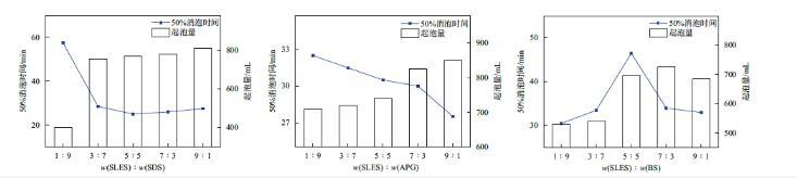 实验测得SLES,SDS,APG和BS在w=0.2%时的50%消泡时间依次为28.5,45,41和9 min,起泡量依次为800,290,610和700 mL。由图3可知,对比三组复配组分的泡沫性质,SLES/SDS无明显增效,随着SLES质量分数的增加,复配组分的起泡量和50%消泡时间接近SLES单组分。SLES/APG的起泡性和泡沫稳定性有所提升,其中w(SLES):w(APG)=7:3的复配组分有较好的泡沫性能,50%消泡时间、起泡量分别为30 min、825 mL。SLES/BS的起泡量减少,但50%消泡时间明显增加,其中w(SLES):w(BS)=5:5的50%消泡时间、起泡量分别为46.5 min、695 mL。