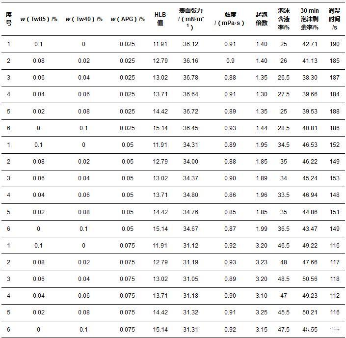 选用非离子-非离子表面活性剂复配体系,以吐温85(Tw85)、吐温40(Tw40)、烷基糖苷(APG)复配组分作为实验对象,实验中发现Tw85和Tw40混合溶液无法产生稳定泡沫,因此将Tw85和Tw40复配组分作为HLB值调节组分,添加APG作为辅助起泡剂。实验结果见表1。