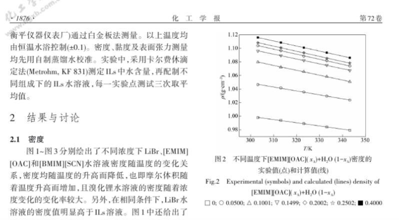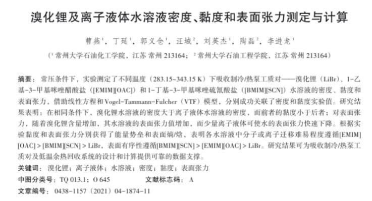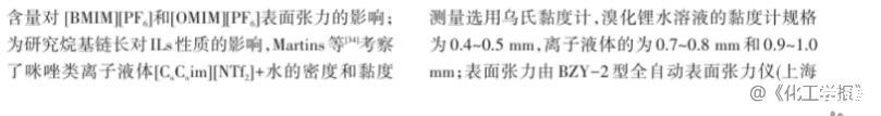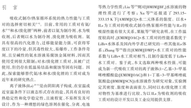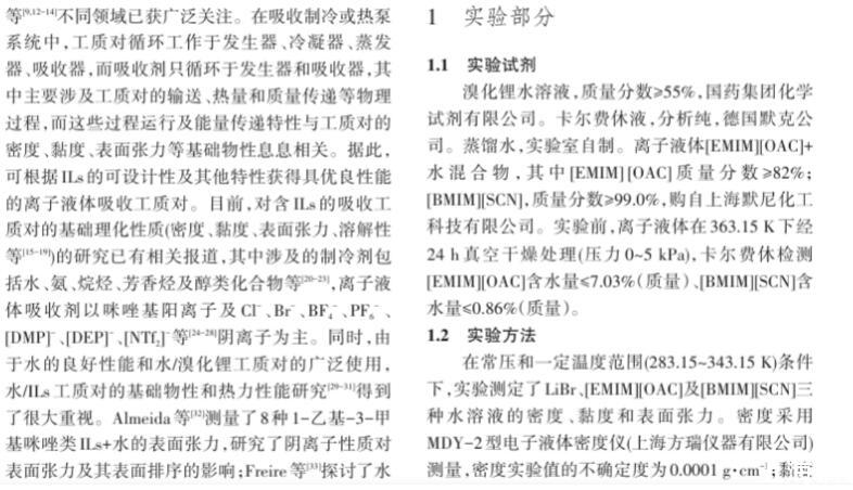 溴化锂及离子液体水溶液密度、黏度和表面张力测定与计算