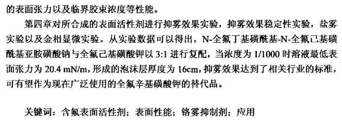 第四章对所合成的表面活性剂进行抑雾效果实验,抑雾效果稳定性实验,盐雾实验以及金相显微实验。从实验数据可以得出,N-全氟丁基磺酰基-N-全氟己基磺酰基亚胺磺酸钠与全氟己基磺酸钾以3:1进行复配,当浓度为1/1000时溶液最低表面张力为20.4mN/m,形成的泡沫层厚度为16cm,抑雾效果达到了相关行业的标准,可有望作为现在广泛使用的全氟辛基磺酸钾的替代品。