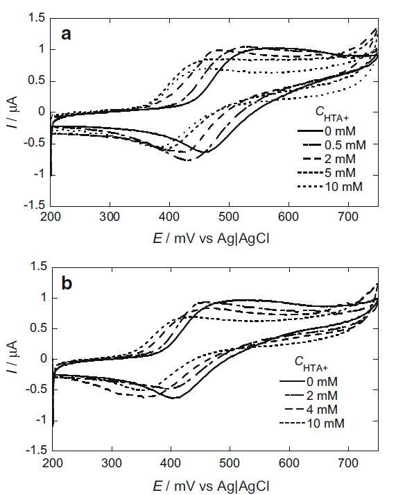 图 7 在 0.5 mM NP (a) 或 0.5 mM β-E2 (b) 存在下,不同 HTA+ 离子浓度下 I2/I− 的循环伏安图:0.5 mM NaI、5 mM hp-β-CD、0.49 M Na2SO4 , 0.01 M H2SO4