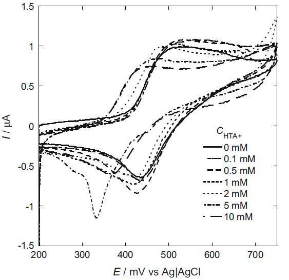 图 6 不同 HTA+ 离子浓度下 I2/I− 的循环伏安图:0.5 mM NaI、5 mM hp-β-CD、0.49 M Na2SO4、0.01 M H2SO4