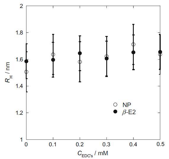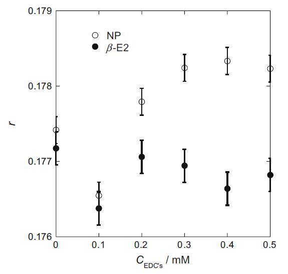RB 分子在胶束表面区域溶解得越硬,r 值越大[15]。 r 值的变化如图 3 所示。在 0.1 mM 时,r 值下降。 这表明 EDCs 开始溶解到胶束中扰乱了 RB 分子在胶束表面的紧密堆积。 随着NP浓度的增加,r值增加。 然而,随着β-E2浓度的增加,r值一度恢复并似乎一点点下降。 这表明 NP 的增溶使胶束表面更加刚性,而 β-E2 的增溶则没有。 NP在结构上更类似于HTA+。 因此,NP在胶束中的HTA+离子头之间增溶,降低了胶束表面离子头的静电斥力,使胶束更加稳定和刚性[16]。 另一方面,β-E2 似乎会干扰 HTA+ 的取向并降低胶束表面的刚度。