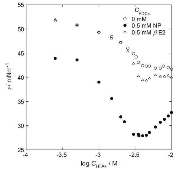 表 2 在含有 0.49 M Na2SO4 和 0.01 M H2SO4 的 5 mM hp-β-CD 存在下,HTA+ 溶液在不同 NP 或 β-E2 浓度下的 cmc 和表面过量 (Γmax) 值