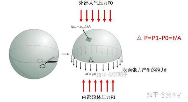 而这里有一件非常关键的事请,就是由于表面张力的存在,弯曲的表面就会在两侧形成压力差。就好像紧绷的气球,其内部压力要高于外部的压力。这种压力差来自哪里?当然就是气球皮膜紧绷的张力。由于气球的弯曲表面,使得其张力最终表现为内部压力的升高。
