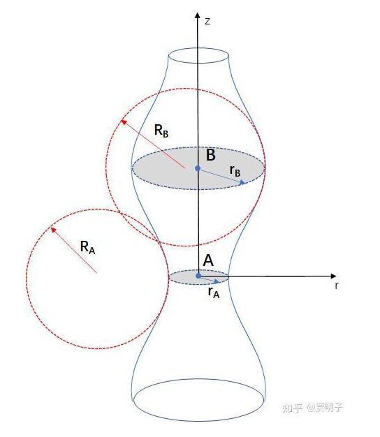 在A点,z方向上产生了负曲率(半径RA),而r方向上,由于半径变小,曲率变大。也就是说,A点上的曲率变化产生了两个效果: