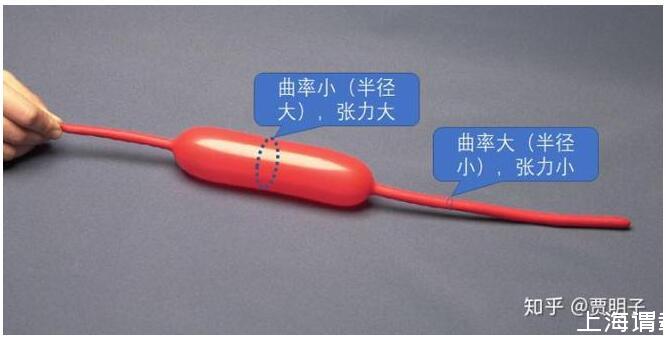 气球内部的气体压力处处相等,但是,接触过这种气球的人都有一个经验,就是粗的地方绷得紧,而细的地方绷得就不那么紧。如上图所示,绷得紧的地方和绷得松的地方,产生的压力差是相等的,但是他们的曲率是不相等的:曲率越大,同样的张力所能产生的压力差就更大。