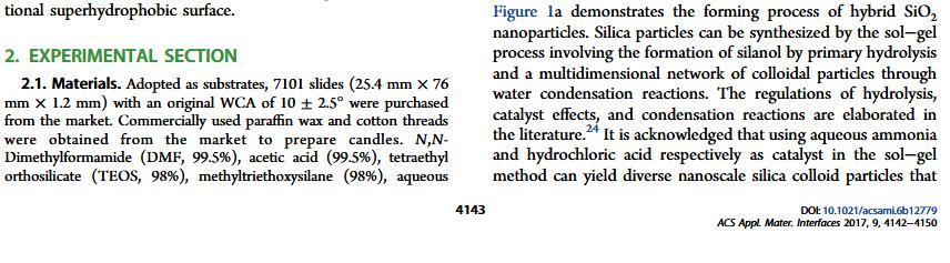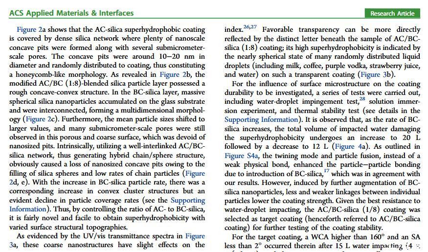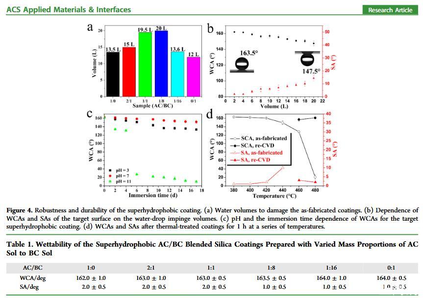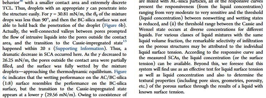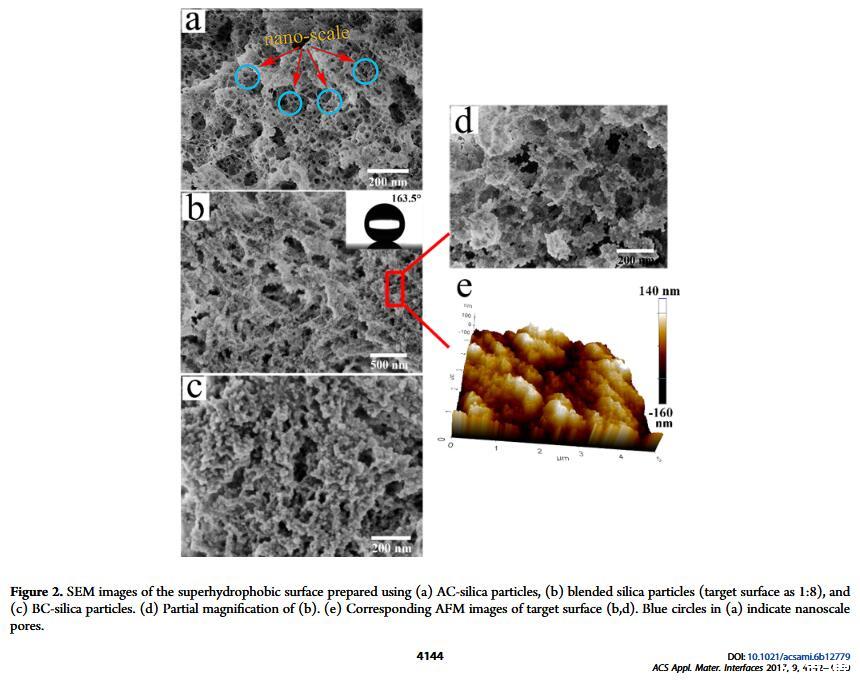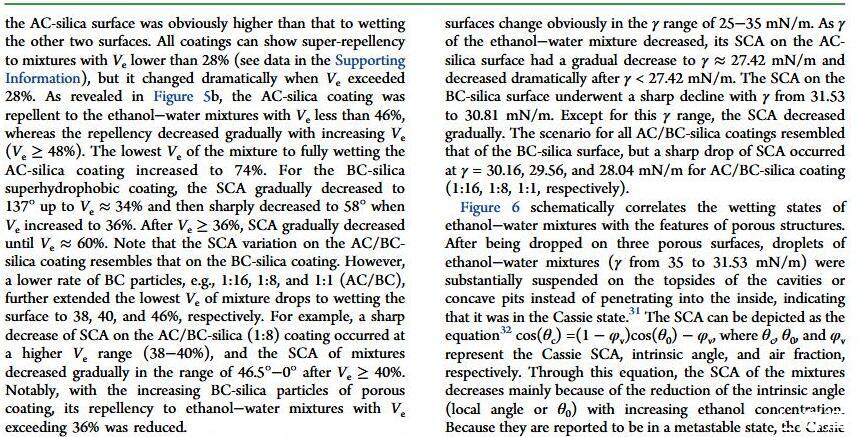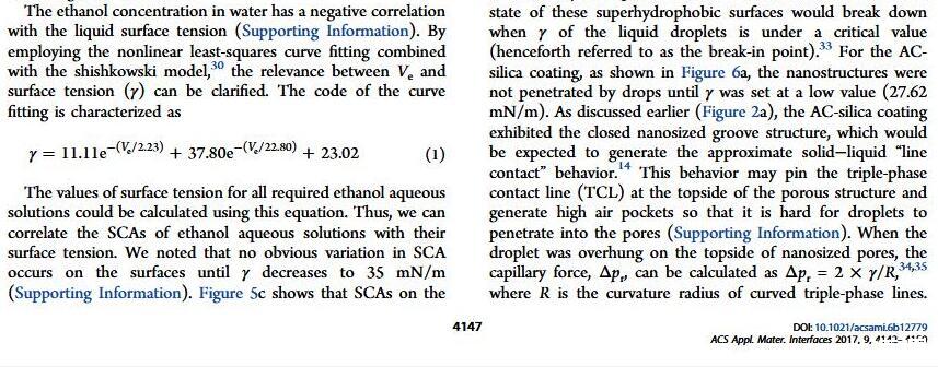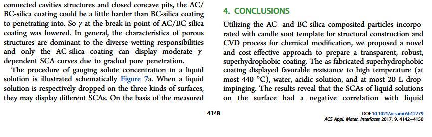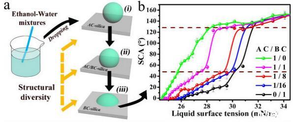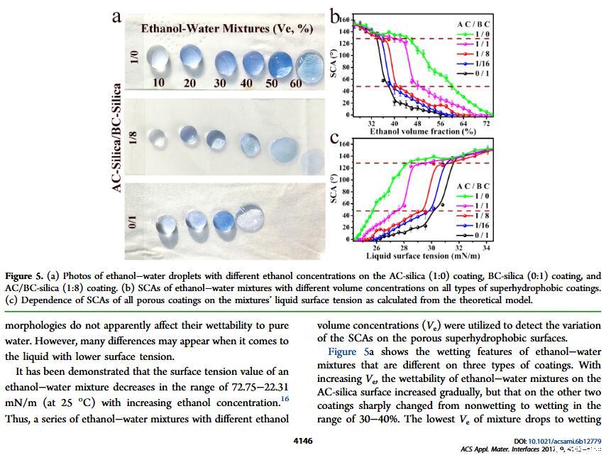结果表明,以正硅酸四乙酯为前驱体通过酸性和碱性水解法制备了不同形貌的纳米二氧化硅溶胶,通过混合两种溶胶可制备出具有颗粒间键桥强度高的亚微米级凸起和纳米级凹坑的结构的涂层。通过控制酸碱催化溶胶混合比例,蜜桃性爱视频网站可以制备出具有不同微观结构的超疏水涂层。结果表明具有不同结构的涂层具有不同的润湿性-表面张力关系,随着涂层制备时碱催化溶胶的比重增加,纳米级凹坑结构逐渐减少,表面更容易被低表面张力液体侵入,因而接触角下降更剧烈。并且在有机物水溶液,包括:甲醇、乙醇、正丙醇、异丙醇、乙酸、丙酮、N,N’-二甲基酰胺等,都具有同样的接触角和浓度(表面张力)响应规律。