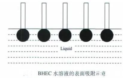 乙醇和正丁醇属于一元醇,这两种醇的加入能使BHEC水溶液的表面张力减小。当未加入一元醇时,BHEC溶于水后,BHEC分子能自发地吸附在溶液的表面,使溶液的表面张力降低,表面吸附的BHEC分子越多,溶液表面张力的降幅越大,当然这其中有一个吸附饱和的问题。但由于BHEC分子在水中处于空间交联网络结构,其定向排列时分子间存在一定的空间(见上图)。加入乙醇或正丁醇后,醇分子可以插入BHEC分子间的空隙,使溶液表面吸附的分子达到紧密排列的状态(见下图),导致BHEC水溶液的表面张力继续降低。