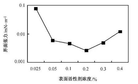 界面张力随着表面活性剂浓度的增加先减小后略有增加。这是由于表面活性剂在浓度较低时,在油水界面上吸附的分子较少,分子排列不够紧密且不规则,界面张力较大;浓度增大时,油水界面上吸附的分子逐渐增多,分子排列变得紧密而整齐,达到吸附饱和,界面张力急剧下降;继续增大表面活性剂的浓度时,在油滴附近开始出现胶团,阻止了部分表面活性剂在油水界面的吸附,界面张力开始回升。