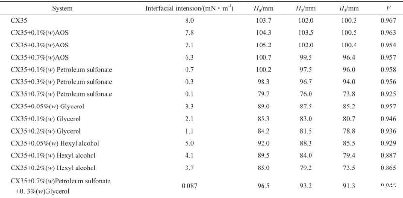 CX35虽具有降低油水界面张力的能力,但加入CX35后,油水界面张力仍大于10-1mN/m数量级。离子型表面活性剂与醇混合可降低油水界面张力,但醇会影响驱油剂的起泡性能。不同复配体系的油水界面张力见表1。由表1可看出,石油磺酸盐降低界面张力的效果尤为突出。这是因为,石油磺酸盐含苯环及类苯结构,且苯环上有疏水碳链,与原油中的沥青质和芳烃等物质结构相似,故石油磺酸盐易吸附在油水界面上从而降低油水界面张力。同时,石油磺酸盐还可提高驱油剂在空隙中的洗油效率,也可通过乳液产生的阻力提高驱油剂的波及效率。在m(CX35)∶m(石油磺酸盐)∶m(甘油)=1∶0.7∶0.3的条件下得到的ZX35的起泡高度可达到95 mm以上,稳泡能力达到0.946。