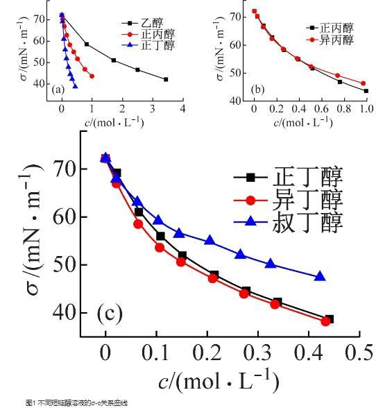 6种短链醇溶液分子结构对表面张力和表面吸附性能的影响
