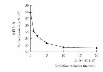 空化时间对原糖溶液表面张力的影响配置浓度为0.15g/mL的原糖溶液3.5L,水浴加热溶液到60℃,在0.2 MPa压力下通过空化装置循环不同的时间(1,2,5,10,20min),测定空化前后原糖溶液的表面张力的变化。
