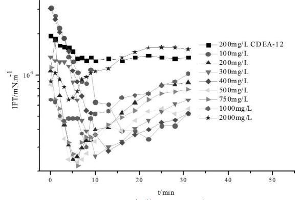 图2浓度为200mg/LCDEA-12分别与不同浓度NNR复配油水动态界面张力关系