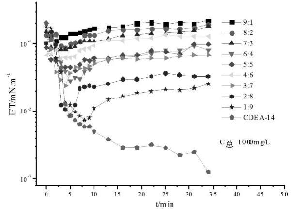 图1总浓度为1000mg/L CDEA-12和CDEA-14不同复配比例油水动态界面张力关系