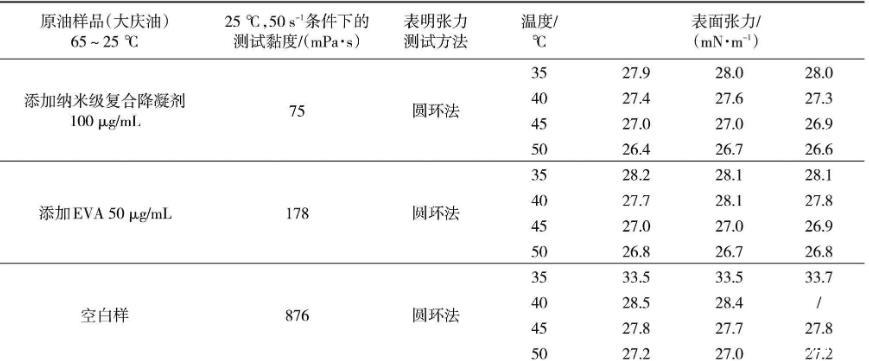 从表1可以看出,处理后添加纳米级复合降凝剂100μg/mL大庆油样、添加传统EVA降凝剂50μg/mL大庆油样、大庆空白油样在25℃、50 s-1测试条件下的黏度是依次升高的,添加纳米级复合降凝剂100μg/mL的大庆油样品黏度最低,为75 mPa·s。相同的测试温度条件下,黏度越大的油样表面张力越大。其中,空白油表面张力最大,添加传统EVA降凝剂的油样次之,添加纳米级复合降凝剂的油样最小。原油油品的表面张力随着温度的降低而增大。