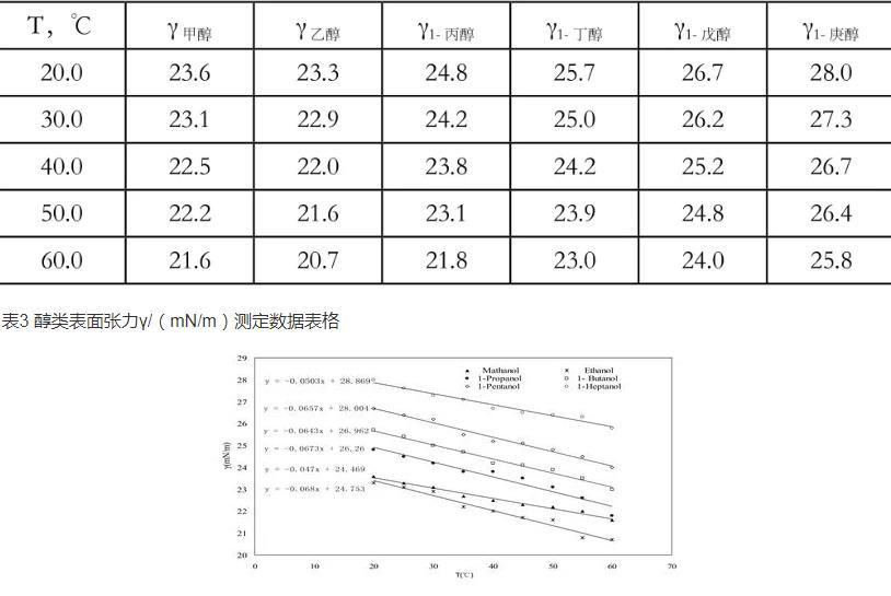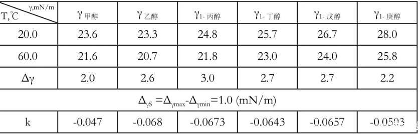 表1醇类在不同温度下的表面张力