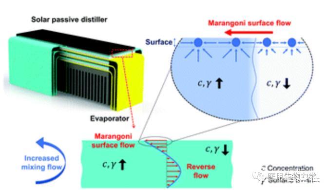 海水和空气之间的界面存在盐浓度梯度,并由此产生表面张力梯度,其为溶剂和盐份溶质的移动提供了额外驱动力。沿该界面的表面张力梯度产生切向力,形成滑移速度,驱动海水从低表面张力向高表面张力方向流动。