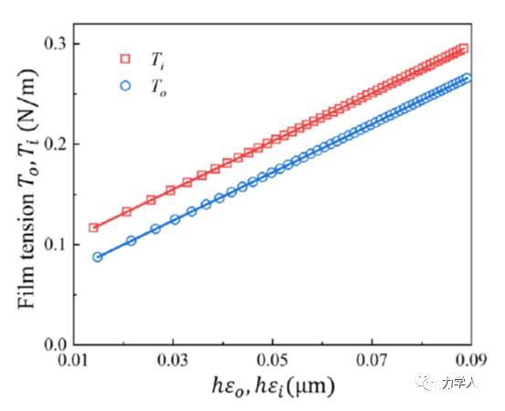 基于该平衡构型的解析解,本研究发现薄膜在接触线附近的弹性应变可以由薄膜的鼓包角解析给出。由此,本文给出了在一般条件下,薄膜在接触线附近的弹性应变随鼓包角的解析关系。图3表明,基于该解析关系给出的薄膜弹性应变可以很好的描述薄膜总张力随薄膜厚度及接触线附近应变的演化规律。基于此,本文提出了采用线性外推薄膜总张力随薄膜厚度和接触线附近薄膜应变乘积的方法来确定固体表面张力的方案。