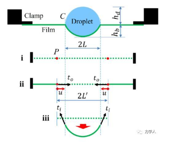 基于此背景,北京航空航天大学邵丽华教授、杜锋助理教授及其合作者发展了一种基于液滴-薄膜体系来确定固体表面张力的理论模型,并通过实验进行了验证。如图1所示,在液滴作用下,薄膜发生鼓包变形。该项工作首先建立了确定液滴-薄膜系统(图1)平衡构型的理论模型,研究了薄膜表面弹性模量和表面张力在决定该系统平衡构型中的作用机制,给出了确定平衡构型的五个非线性方程。通过系统自由能最小原理,可以确定系统的平衡构型。当薄膜的变形是小量时,可以得到该平衡构型的解析解。