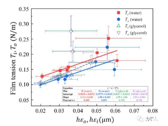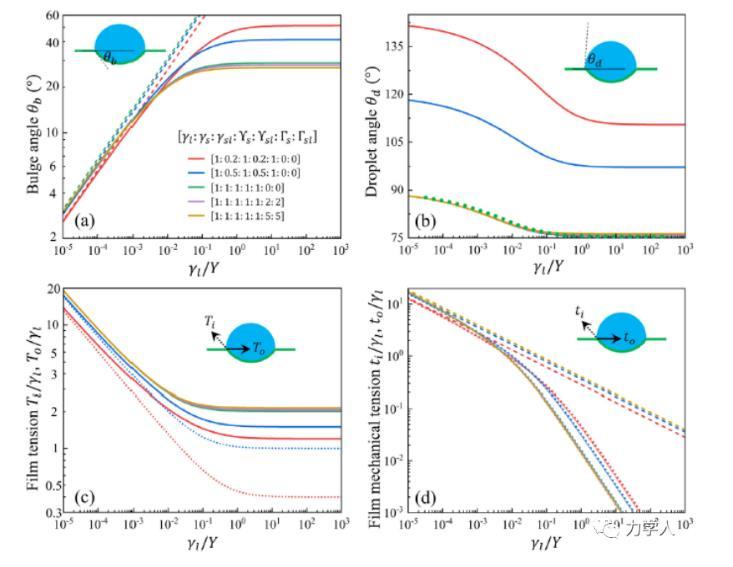 综上所述,本文基于理论模型揭示了表面张力在调控液滴-薄膜体系平衡构型的作用机制,首次发现了薄膜张力随薄膜鼓包角的非线性解析关系,以此完善了基于薄膜-液滴体系确定固体表面张力的方案,可用于对高分子材料表面张力的实验测量和探索高分子材料表面张力与表面能的关系。