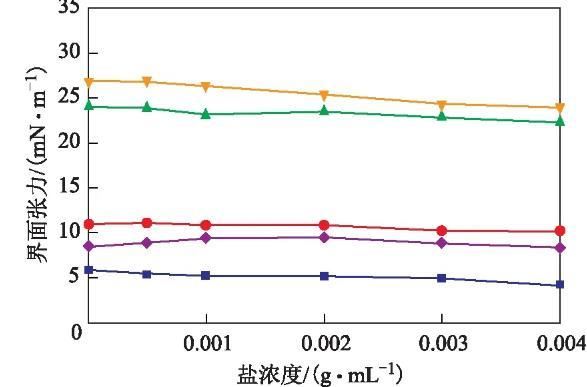 图4水相盐浓度对油水界面张力的影响饱和分;▲—芳香分;●—胶质;■—沥青质;◆—380号燃料油