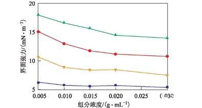 图1 380号燃料油中四组分的油水界面张力曲线饱和分;▲—芳香分;●—胶质;■—沥青质