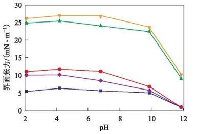 图3pH对油水界面张力的影响饱和分;▲—芳香分;●—胶质;■—沥青质;◆—380号燃料油