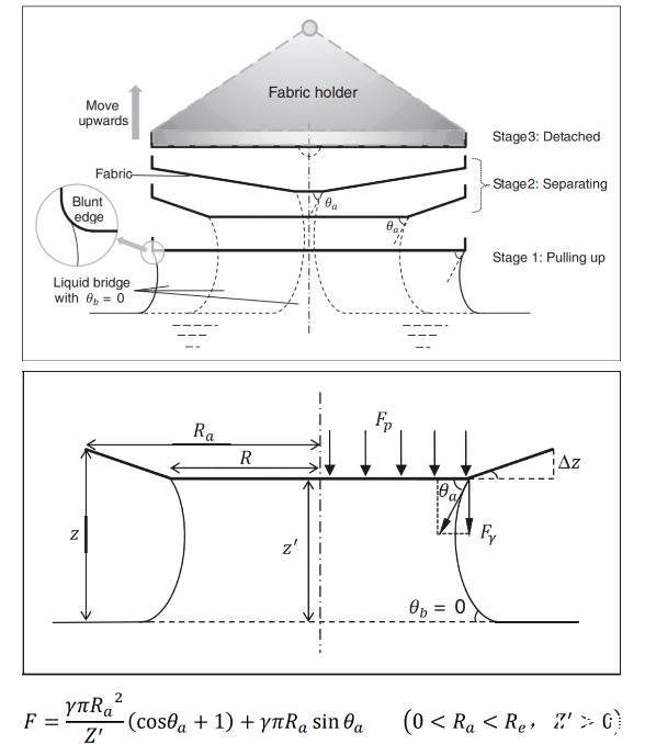 基于液体表面张力的理论模型从湿态贴附现象的成因出发进行构建,可预测分离过程第二阶段(逐渐分离阶段)中各种织物与液体之间的贴附力。