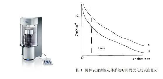 图1显示两个不同表面活性剂体系A和B在不同吸附速度下,随时间t而变化的表面张力γ,也可以叫作动态表面张力。这些曲线可以通过使用KRÜSS最大气泡压力法来测量。气泡在表面活性剂溶液中以不同的频率形成,控制气泡形成的时间并且测量气泡中所产生的最大压强,可以得到不同时间下的表面张力。在短时间内,观察到表面活性剂体系B比A的体系所带来的表面张力更小。