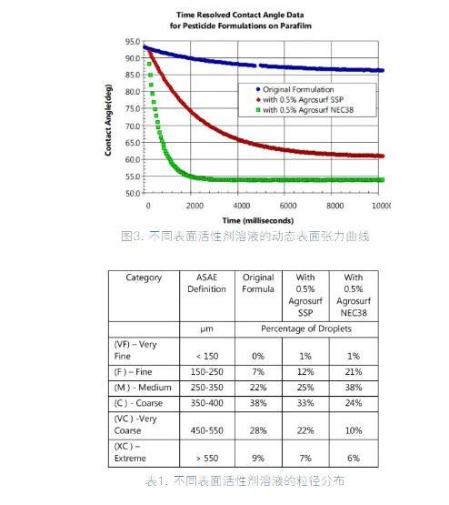 从图3和表1示例曲线可以明显看到,可以通过控制动态表面张力来优化雾滴的粒径,张力在一定时间内下降的越快,雾滴粒径越细腻。为了避免雾滴尺寸过小而产生雾滴的漂移,可以将表面活性剂的张力调控在一定范围。