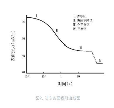 许多体系的动态表面张力和时间对数的曲线可分为4个阶段:诱导区、表面张力快速下降区、介平衡区和平衡区。在诱导区,由于吸附在界面层上的助剂质量浓度太低,溶液的表面张力较大;随着助剂大量被吸附到溶液表面,表面张力急剧降低,就形成了快速下降区;而随着溶液表面助剂分子的积累,吸附接近饱和时吸附速度变慢,就形成了介平衡区;足够长的时间后当表面吸附达到饱和体系进入动态平衡阶段表面张力达到平衡,此即为平衡表面张力。表面活性剂种类和质量浓度不同,其溶液体系达到上述各阶段所需时间不同,表现为各溶液体系间动态表面活性的差异。
